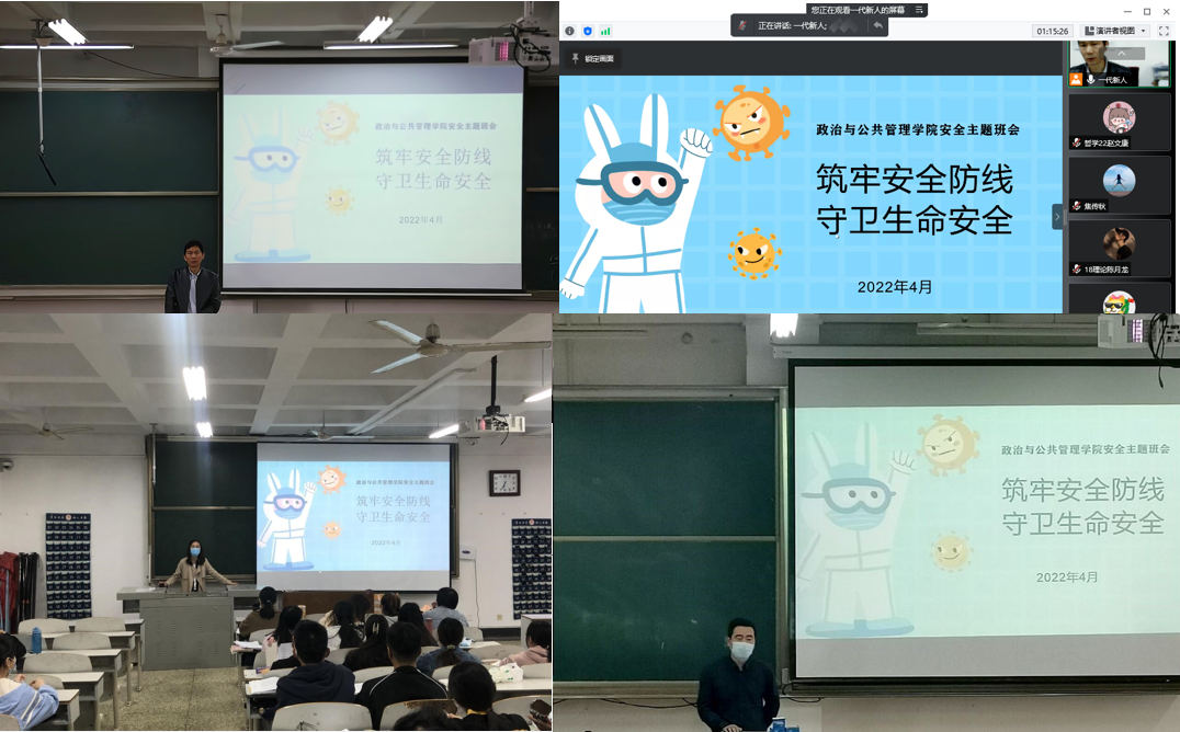 各年级各班分别于4月28日、4月29日在JA206、JA103、JA302和腾讯会议线下线上方式召开安全主题班会。本次班会分别由18、19级辅导员王元如、20级辅导员耿晓敏、21级辅导员马腾主持,各年级各班学生全体参加。班会主要分为疫情防控、消防安全、预防诈骗、预防溺水、反对校园欺凌、抵制邪教六个部分。