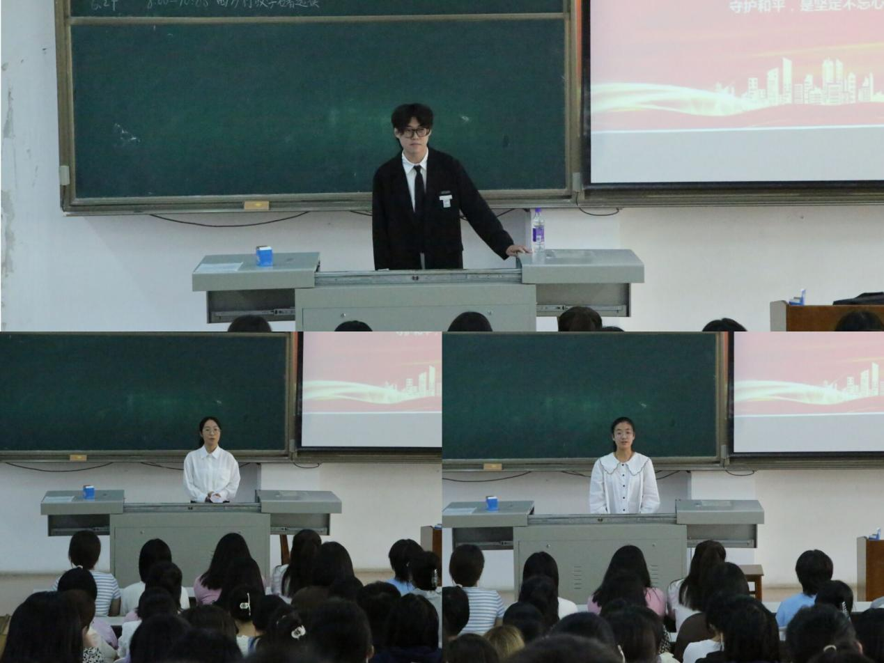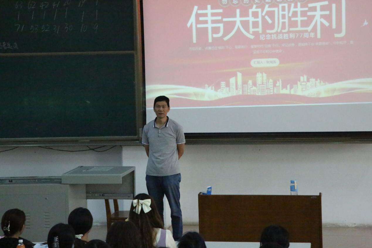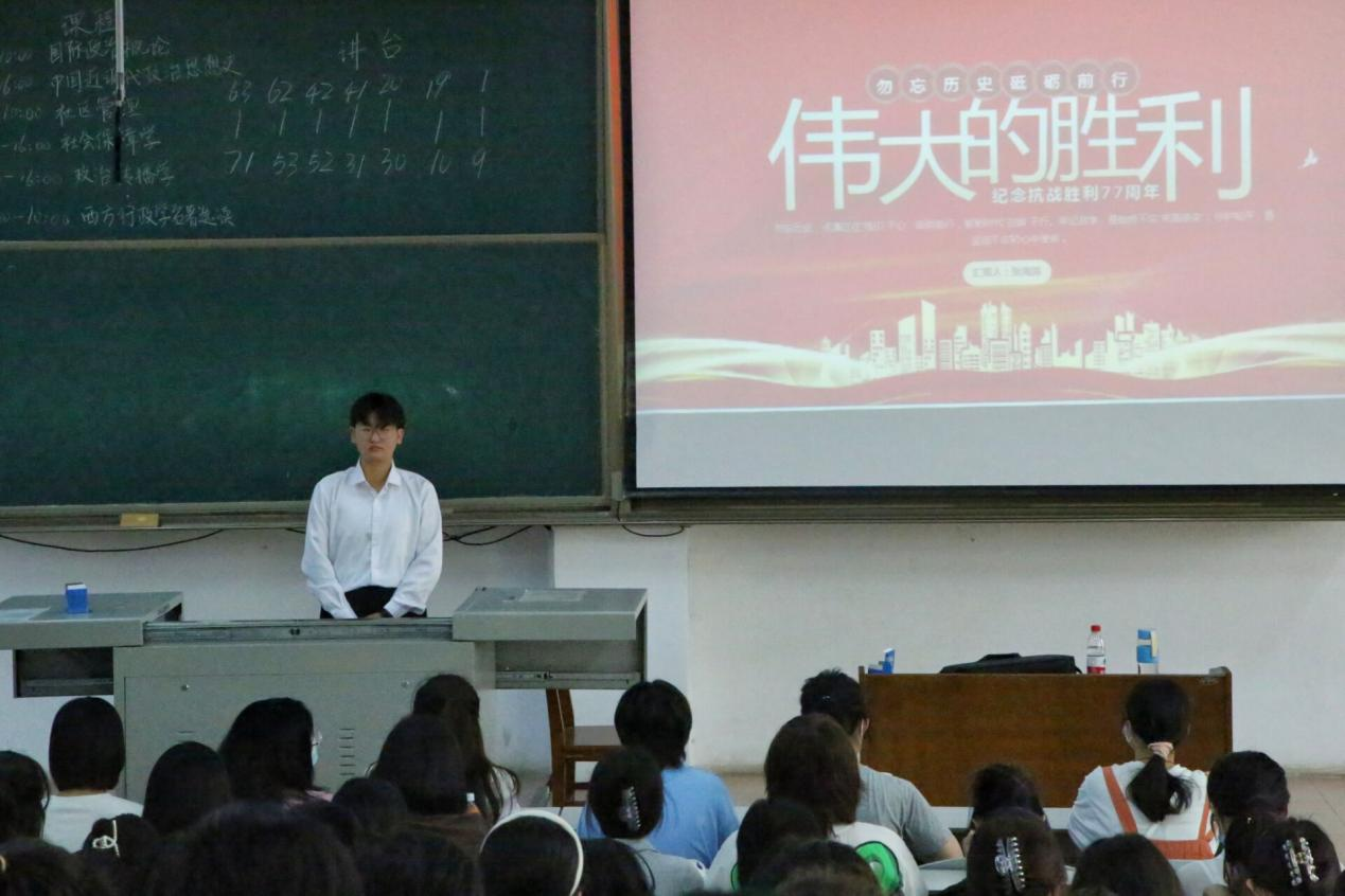 本次活动由弘道宣讲团副社长张海涛主持。活动伊始,张海涛从历史维度,讲述了“九一八”事变的起因和经过。宣讲团成员刘子恒、杨婷婷用包含深情的语言现场朗诵了《永远的丰碑》,宋轩宇、于涛、段怡锐作为老生代表从新时代大学生的角度出发,就抗战胜利七十七周年发表了自己的感悟,表达了对无数革命先烈深深的敬仰与缅怀,激励全体22级新生,从历史中汲取奋进力量,循着先辈的足迹勇毅前行。22级新生代表李岩、任仪、张珂涵等同学也有感而发,纷纷表示身处和平年代的我们,铭记历史,明确自己的初心使命,认真投入到学习中去。