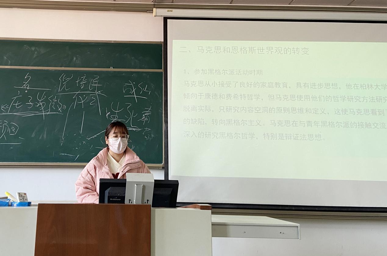 2022级牟茜同学分享的书籍是黄楠森的《马克思主义哲学史》。她详细地为大家介绍了19世纪40年代中期到19世纪末期马克思主义哲学的产生、发展及其在欧洲的传播,并从马克思主义哲学史的历史条件和理论来源讲述到马克思、恩格斯世界观的转变,最后阐释了马克思主义哲学在欧洲革命时期的运用、验证和发展。
