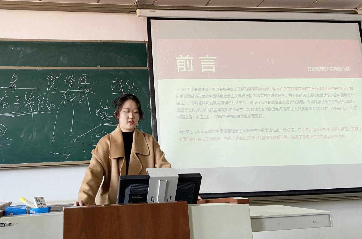 2022级孙振龙同学分享的是《习近平谈治国理政》第四卷。这部重要著作站位高远、思想深邃、内涵丰富,呈现了习近平总书记治国理政的重大理论创造、重大战略部署、重大思想引领。