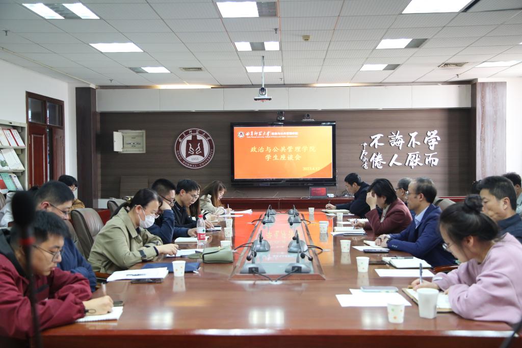于JC909召开学生座谈会。学院领导班子、教研室主任、专业教师代表、辅导员和学生代表参会。
