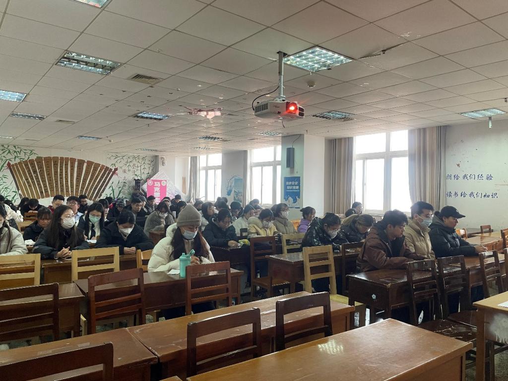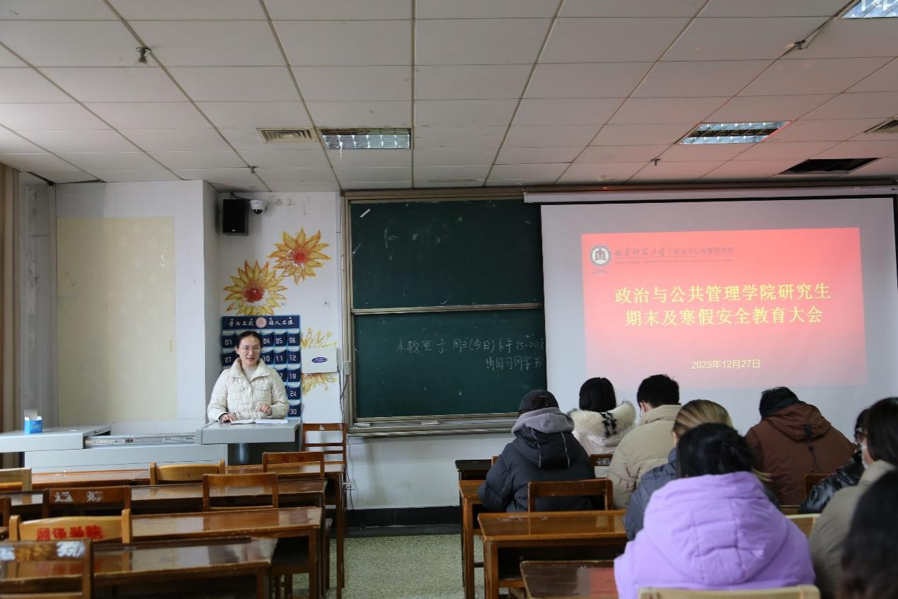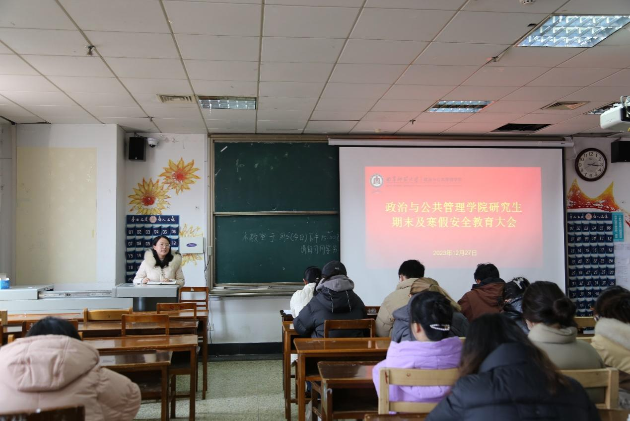 在JC605教室召开研究生期末及寒假安全教育大会,研究生辅导员徐莉、研究生教学秘书刘雪婷以及2022级、2023级全体研究生参加本次大会。