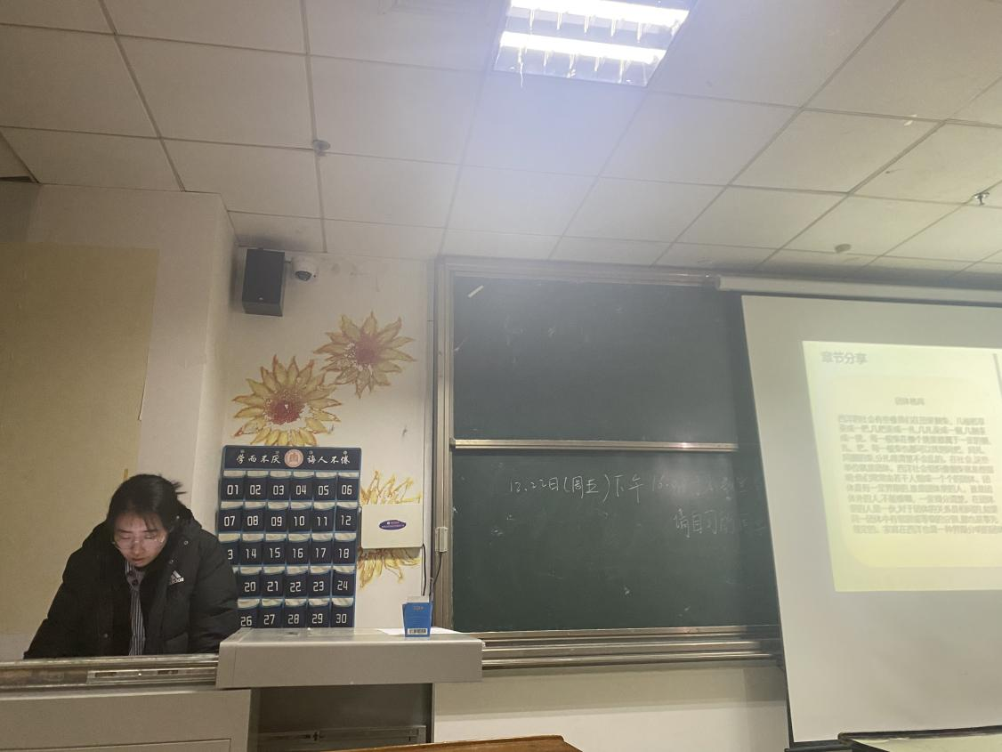 随后,2023级王亚轩同学分享了她对《乡土中国》的读书心得。王亚轩同学提出了关于此书的问题——“孔子‘克己复礼’是从公利出发还是私利?”并加以解释,分析了孔子在实践过程中已经隐隐意识到了差序格局的不足,觉得只有伦常是不够的,还应该有一种笼罩一切的普遍适应的价值标准。王亚轩同学指出本书中认为,乡土中国中孔子的推是水纹波浪向外扩张,先承认一个己,推己及人的己,对于这己,得加以克服于礼,克己就是修身。