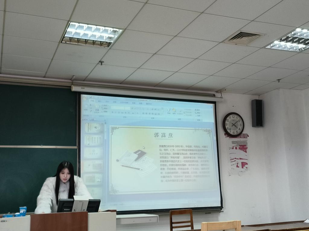 2022级孙钟琪同学分享郭嵩焘《实学思想研究》一书,讲述郭嵩焘“实学”,认为先王所遗留的经典就包含着体用合一的原则,他说:“三代典章制度散佚无征,犹得存其遗文,以知质文升降之数,因革损益之宜,因家所以治乱兴衰,既得备知其故,而又以窥理道之精,达人事之变,进退揖让之节,莫不备于其中。”