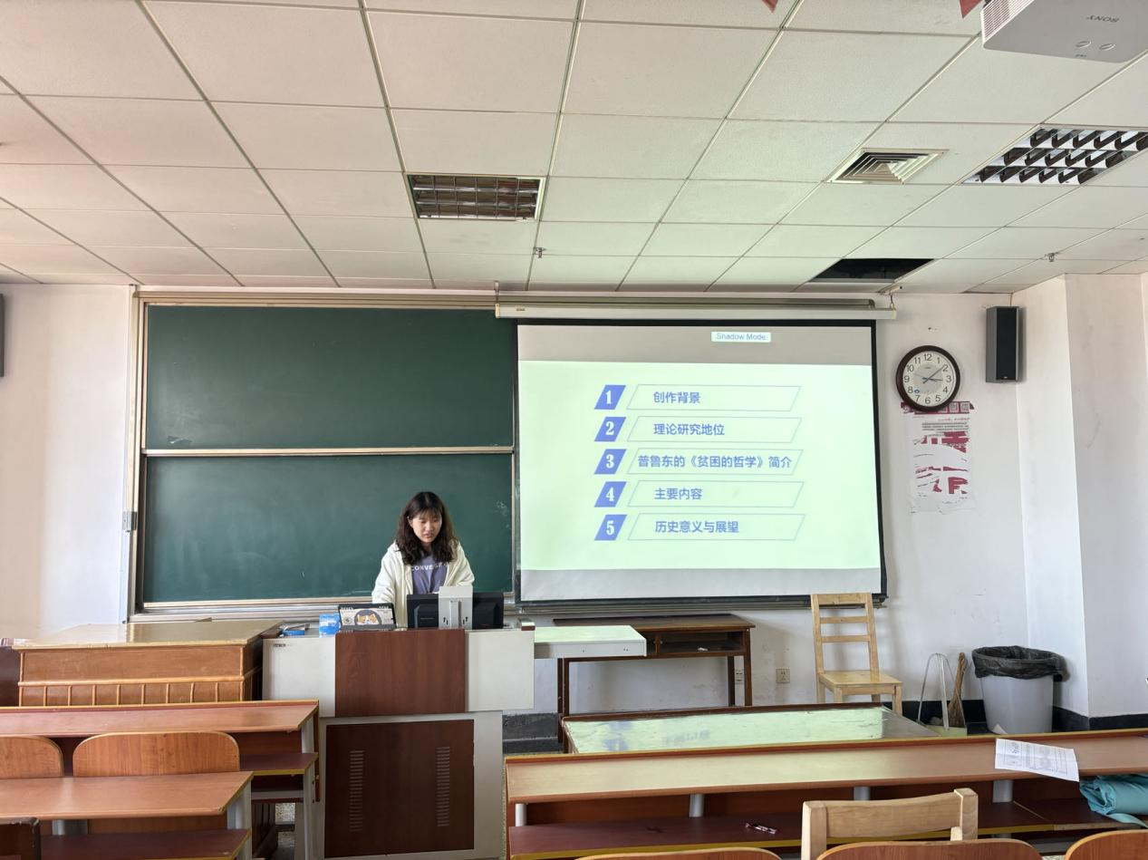2023级岳丽丽同学从批判的角度分享了《哲学的贫困》一书,这本书以全新的历史唯物主义为理论武器,从经济学和哲学两个方面批判了蒲鲁东唯心主义经济学,揭露了其对资本主义批判的非科学性和小资产阶级的反革命性。她结合”马克思认为蒲鲁东将哲学与国民经济学相结合的尝试是不成功的”这一问题,分享了自己的观点。