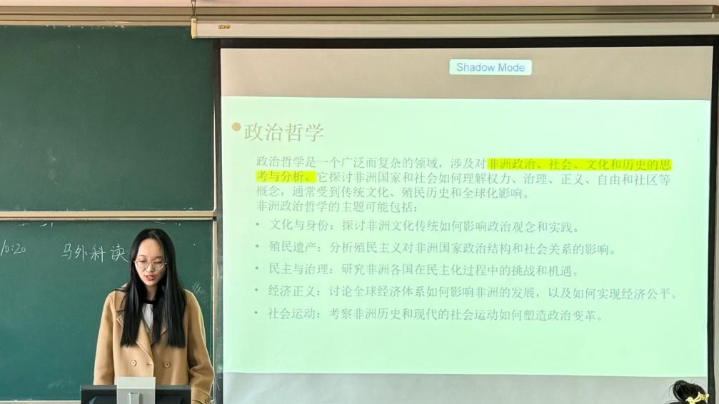 2024级肖婧玮同学分享的是《非洲哲学——跨文化视域的研究》这本书,她以政治哲学角度向大家介绍了非洲国家和社会对权力、治理、正义、自由等概念的理解,并根据自身理解对非洲政治、社会、文化和历史等方面进行了思考和分析。最后,她提出了两个重要问题,即什么是非洲哲学的核心概念与乌班图哲学的实践意义是什么,引发了同学们的思考。