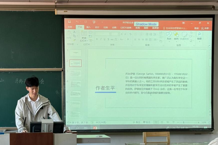首先,2024级周涵同学分享了《科学的生命》这本书,他介绍了作者生平、科学史的发展历程以及历史脉络并结合自己的阅读体会向大家阐释了科学史的重要性。最后,他提出了要在关注科学本身的同时也要理解作为人类文明发展的关键的科学史。