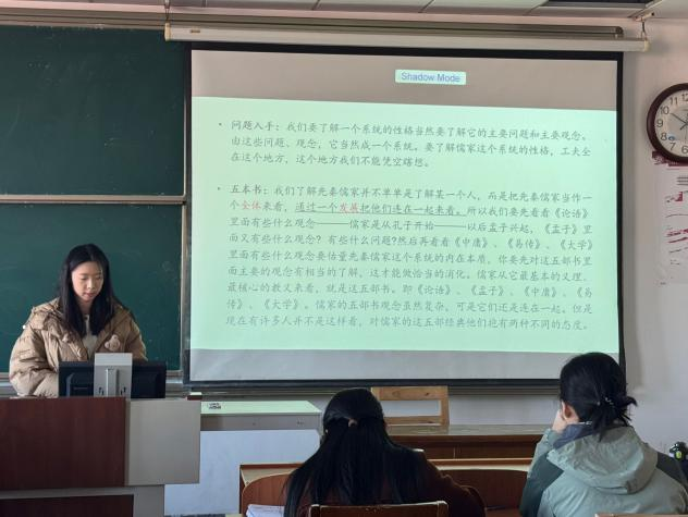 2024级秦羽珂同学分享的是《中国哲学十九讲》,她按照时间顺序将中国哲学的特殊性问题、先秦诸子的起源及系统、魏晋玄理的内容及价值、佛教的哲学问题、宋明儒学等方面进行了重点概括。最后,她结合自己的阅读体会向大家提出如何正确看待儒家系统之性格的问题。