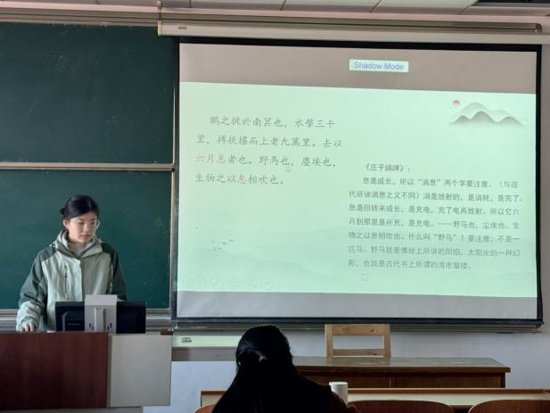 2024级朱文迪同学分享的是南怀瑾的《庄子諵譁》,以自身理解为基础向大家解读了“平凡”与“神圣”的辩证关系,最后,她提出该如何理解南怀瑾先生所解释的“圣人”是最平凡的这一问题。