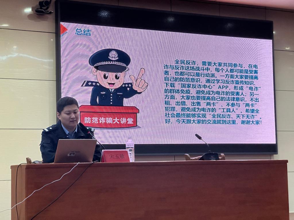 宋玉敏警官凭借其丰富的反诈经验,通过生动且富有感染力的真实案例,深入剖析了电信网络诈骗的概念、发展历程、诈骗类型、高发原因和危害,揭露了诈骗分子的作案手法与套路,使师生们对电信网络诈骗有了清晰的认知。此外,宋玉敏警官围绕“如何拒当电诈工具人”这一主题,详细解读了“两卡犯罪”的概念、惩罚措施及相关案例,并着重强调了防范电信诈骗的具体方法,教导师生如何识别诈骗信息、保护个人信息安全。最后,他强调全民反诈需要大家共同努力,提升法律意识和防范意识,积极投身反诈行动,共同守护校园这片净土。