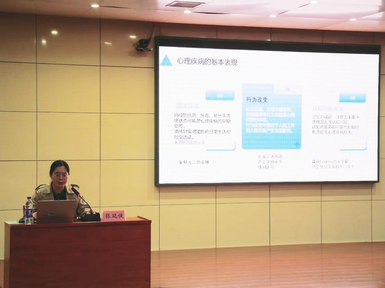 张廷侠主任以“成为自己的心理咨询师”为题,围绕“了解与识别”、“悦纳与内省”以及“放松与阅读”三个方面展开深入讲解。她通过实际案例分析,指出大学生常见的心理问题,并强调通过情绪行为链的多维度分析,积极应对心理困扰。张主任的讲解生动具体,帮助同学们更好地认识自我、调节情绪,提升心理健康水平。