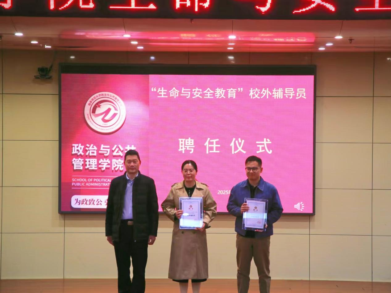 会上,张忠凯书记为张廷侠主任、迟佰强大夫颁发“政治与公共管理学院生命与安全校外辅导员”聘书,正式聘请两位专家为学院的心理健康教育工作提供长期指导和支持。