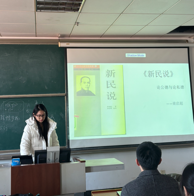 2024级法志宇同学分享了梁启超先生的《新民说》,该书以“新民”为核心,探讨了如何通过道德建设推动社会进步,其中重点论述了公德与私德的关系。她分别介绍了公德与私德的概念,并分析了二者的辩证统一关系。分享结束时,法志宇提出了一个富有前瞻性的问题,“‘公德者,私德之推’,强调私德是公德的基础。但在现实中,是否存在有私德却缺乏公德,或者有公德却私德有亏的现象?如何解释这种现象与《新民说》观点的关系?”。