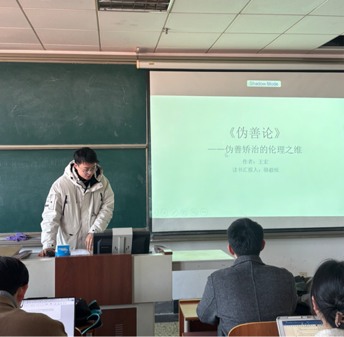 2023级骆毅恒同学首先介绍了王宏的《伪善论》,该书主要围绕伪善的伦理矫正展开,深入探讨了伪善的生成机制及其社会影响。他重点解读了书中关于伪善矫正的伦理之维,特别是伪善的发生机理和成因实证。最后,他提出“伪善和道德虚伪的区别与联系?”这一问题,引发同学们的热烈讨论。