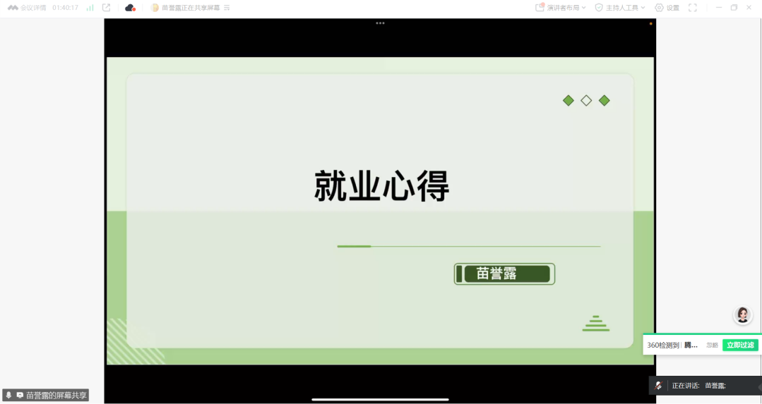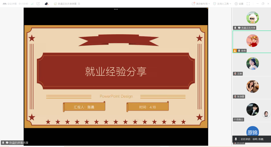 4月18日,龚子仪(升学于陕西师范大学)分别就报考院校、联系导师、招生信息解读等方面为大家详细介绍了自己的升学经验;薛原锦(就职于南阳工艺美术学院)从自我规划、前期准备和面试技巧三方面详细介绍了在求职和面试过程中的心得体会,鼓励大家勇于尝试、敢于探索;陈晨(就职于烟台市芝罘区委党校)着重从人才引进政策解读、心态调整、试讲准备等方面展开讲述;苗誉露(就职于莱西综合行政执法局政策法规服务中心)围绕个人定位、获取信息、面试技巧几个方面提出建议,鼓励同学们在求职中积极尝试。