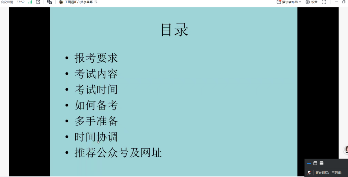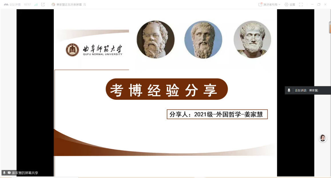 4月24日,姜家慧(升学于西安交通大学)从择校与专业、联系导师、报名方式、考试形式以及相关注意事项等内容展开详述,并勉励师弟师妹要坚持学习,潜心钻研;王玥涵(就职于山东农业大学)分别从就业方向选择、如何备考、应考干货等方面进行了分享;申迎冬(就职于淮阴师范学院)给大家分享了辅导员考试过程中的笔试与面试内容,提醒大家要明确就业目标,不断提升自身的应变能力。