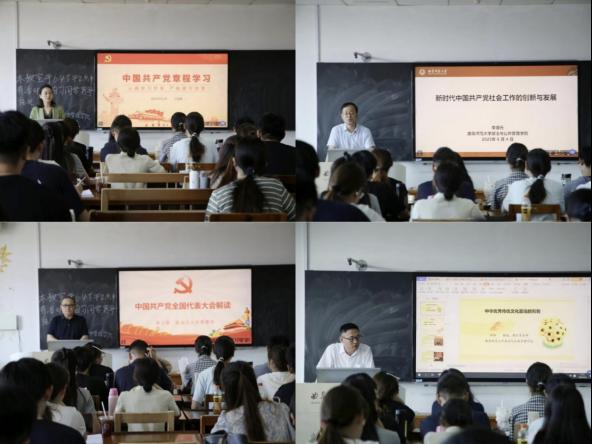 随后,学院党委书记卢瑞霞、党委副书记院长李增元,副院长林士俊,副院长刘伟分别以《中国共产党章程》学习、《新时代中国共产党社会工作的创新与发展》、《中国共产党全国代表大会》解读、《中华优秀传统文化面临的形势》为题讲授了党课。