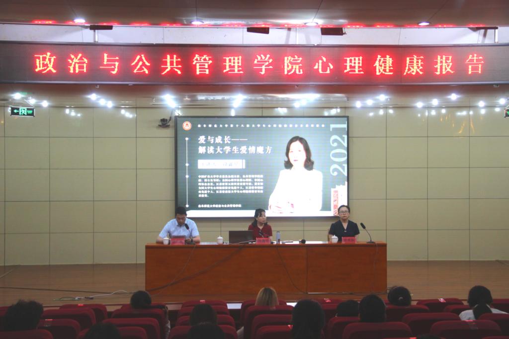 随后,段鑫星教授以“爱与成长——解读大学生爱情魔方”为题做心理健康报告。报告中,段教授通过对大学生恋爱观调查报告结果的展示与分析,引出对“大学生恋爱心理”的解读与探讨。在此基础上,段教授以“认识你自己”、“爱情观评估”、“两性人格特征分析”、“舍弃与自我成就”这四个部分为切入点进行讲解,指出要通过“聆听”的方式深入自我、提升自我,在大学阶段“学习爱、体验爱、感受爱”,培养健康的人格。最后,段鑫星教授将如何树立正确的大学生恋爱观归结为三点:一是认识自我、建立健全的人格,只有两个人格健康、心理成熟的心灵,才会同频共振动;二是树立共同的目标、由“情投意合”走向“志同道合”;三是相互尊重、共同成长,在爱情中互相提升、彼此成就,走向更好的自我。