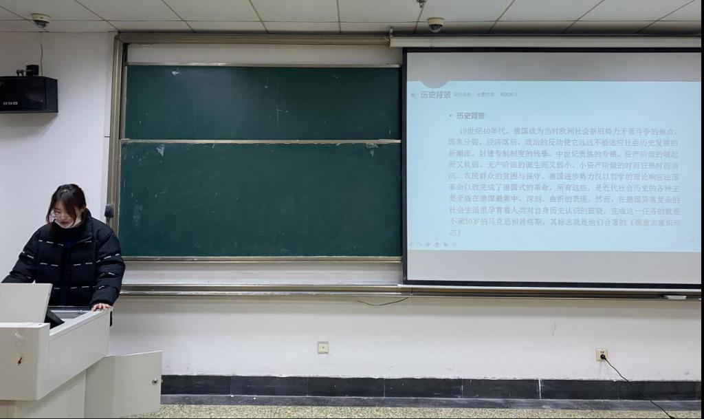 2021级陈怡丹同学分享关于《德意志意识形态》的读书心得。陈怡丹同学聚焦“现实的人”,分别介绍了唯物史观的前提、对黑格尔派“抽象的人”的批判、对费尔巴哈“感性的人”的批判、“现实的人”的根本属性和理解马克思唯物史观的关键。