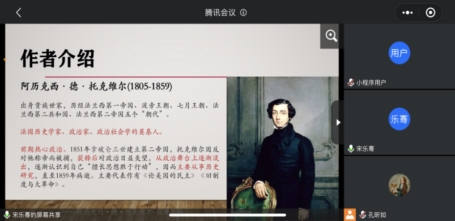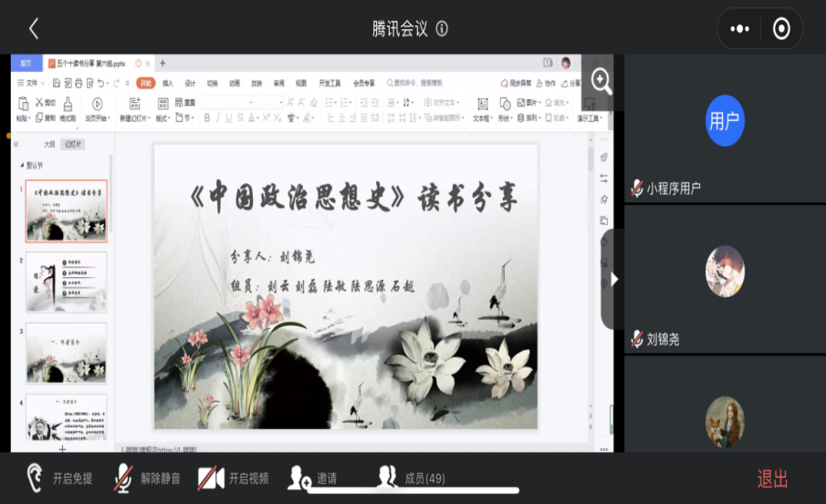 12月5日,2020级政治学与行政学一班读书活动以线上方式进行,同学们积极分享心得体会,在讲解的同时兼备生动性与逻辑性,按照作者简介、章节内容、阅读方法等顺序进行分享。《君主论》、《中国政治思想史》等与本专业有关的书籍介绍,对拓宽学生的知识面,筑牢学生专业理解具有重要作用。活动末尾,孟祥兴老师对各小组进行评价,指导学生进一步提升。