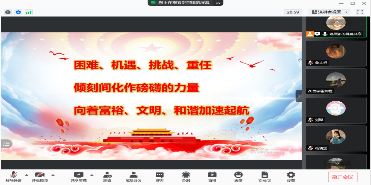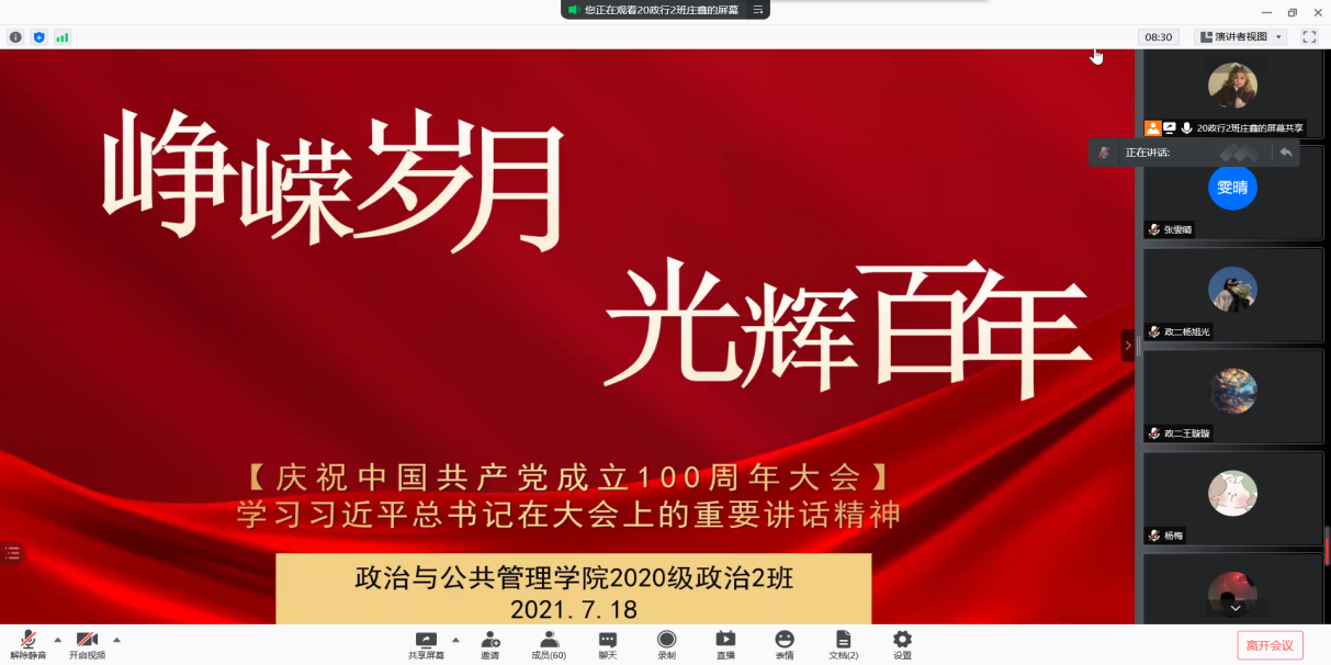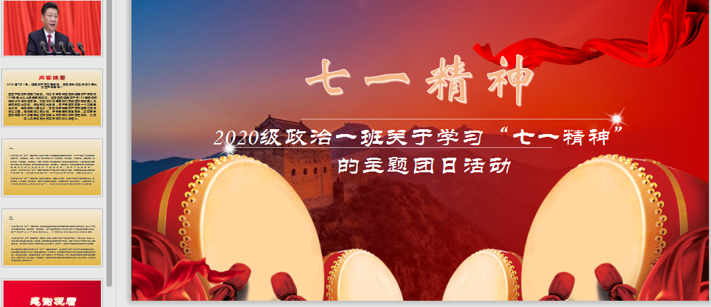 2018、2019、2020级各团支部组织开展主题团日活动学习习近平总书记讲话精神。同学们在会议学习中熔铸了“强信念、创思维、跟党走”的坚定信仰,强化了新时代新青年的责任意识与使命感,并将自己的所感所悟汇集成篇。作为高年级的学生,2018级即将踏入社会成就一番作为,具有更加强烈的责任意识与奋斗精神。2018级同学有感而道:“千秋伟业,百年只是序章,还有更多艰难险阻需要我们去攻克,还有更大胜利等待我们去夺取。作为新时代的青年,我们要不忘初心,砥砺前行,为实现中华民族的伟大复兴不懈奋斗!”理想之光照亮奋斗之路,信仰之力开创美好未来。2019级同学将自身发展方向融入时代洪流,借时代东风之力,扬理想之帆。2020级作为新生力量,具有巨大的创新能力和发展潜能,更加为时代建设献计献策,添砖加瓦。学院团日活动的成功开展充分彰显政院学子一心向党、蓬勃昂扬优良精神风貌。