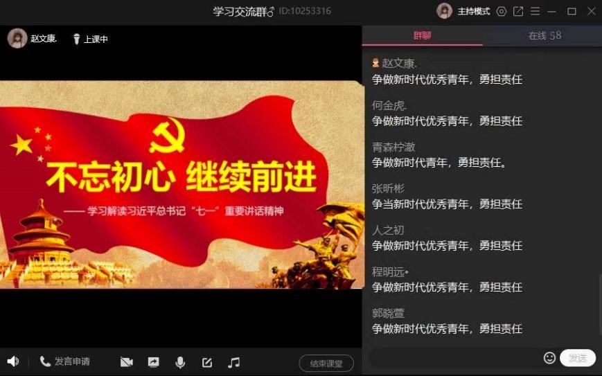 青年团员们加强了对习近平总书记会议讲话精神的学习与贯彻,在实践与学习中,不断增强“四个意识”、坚定“四个自信”、做到“两个维护”,同时采取主题团课,学习交流、暑期社会实践等多种方式,深化对习近平总书记“七一”重要讲话精神的理解、领会与把握,积极响应习近平总书记和党中央的伟大号召,为全面建成社会主义现代化强国、实现中华民族伟大复兴的中国梦而不断奋斗前进。