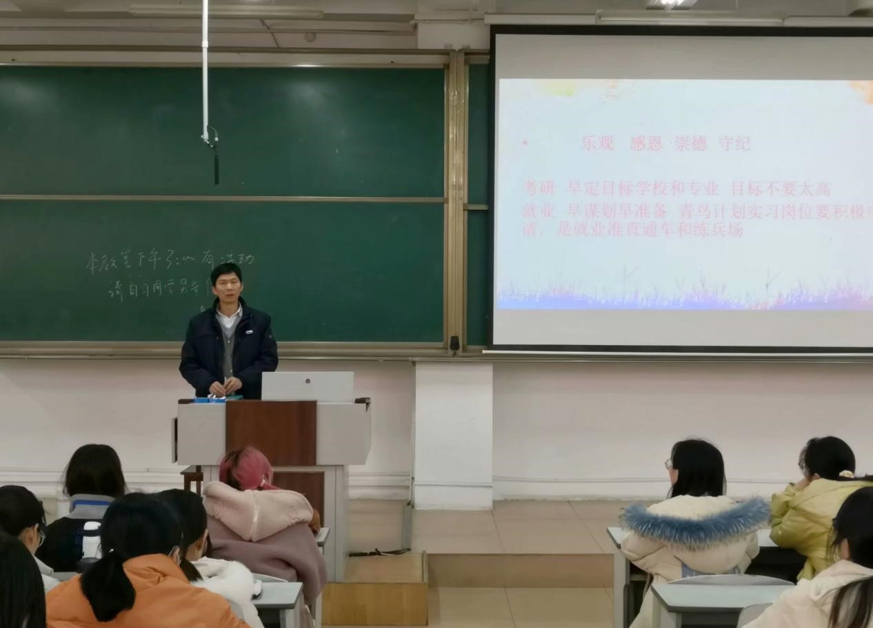 心有所梦,志存高远。本次会议以“做积极健康阳光向上的新时代大学生”为主题,分“乐观”“感恩”“崇德”“守纪”四大模块进行。在“乐观”层面中,王元如认为,学生应不断提升眼界、拓展胸怀,加强意志训练,学会控制情绪,积极提高心理健康水平和认知水平,从而增强自信心与勇气,进一步形成较为全面发展的、开朗进取的个性;“感恩”的作用亦是不可忽视,它是一盏使人们对生活充满理想与希望的导航灯。王元如表示,希望学生在与人和谐相处中始终保持感恩之心,感恩生活中一切体验到的真实的美好;随后,王元如鼓励学生崇尚道德,树立正确世界观、人生观和价值观,践行社会主义核心价值观,积极弘扬社会正能量;最后,王元如强调遵守纪律和行为规范是大学生必不可少的基本品质素养,“没有规矩,不成方圆”,他希望每位同学都应尊重规则,遵守纪律,在符合行为规范的基础上不断提升自己。另外,王元如告诫同学们:“行动就有收获,坚持才有奇迹。”鼓励学生趁年轻多读书,积极策划就业方案,尽早规划考研目标,并坚持不懈地为之付出努力,为自己创造新机遇。
