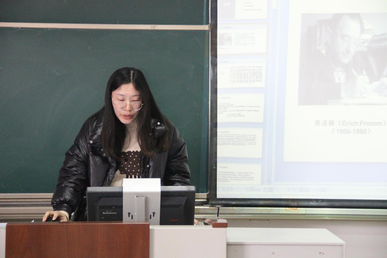 本期政研论坛读书交流会围绕马克思主义哲学相关书目和人物思想展开讨论。首先,2019级李飞飞同学分享了弗洛姆的作品《逃避自由》。该书探讨了资本主义社会使人的孤独和不安全感增多的缘由,并设想了一个人本主义公有制的社会主义社会。她指出二战以后,世界趋于和平与发展,但逃避自由的现象仍然存在,随着时代发展现代人又有了新的生存困惑,我们必须找到摆脱困境的方式,由逃避自由走向追求自由。着眼于现实社会,就要求我们怀有大爱,保留个性,肯定他人,实现人际关系的和谐;同时创造性地去劳动,而不是被利益驱动着工作,主动实现自己的价值。