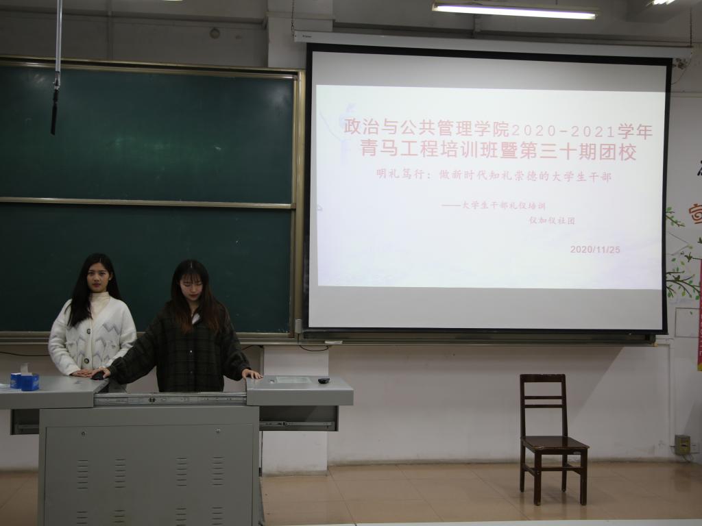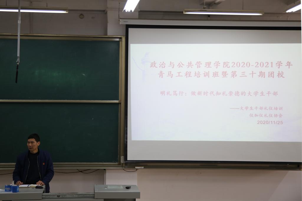 1125日,读漫屋 2020-2021学年青马工程培训班暨第三十期团校第三讲于JA302举行。本次活动以明礼笃行:做新时代知礼崇德的大学生干部为主题,由读漫屋 团委书记王元如主持,仪加仪礼仪协会社团成员主讲,团委学生会全体成员参加培训。