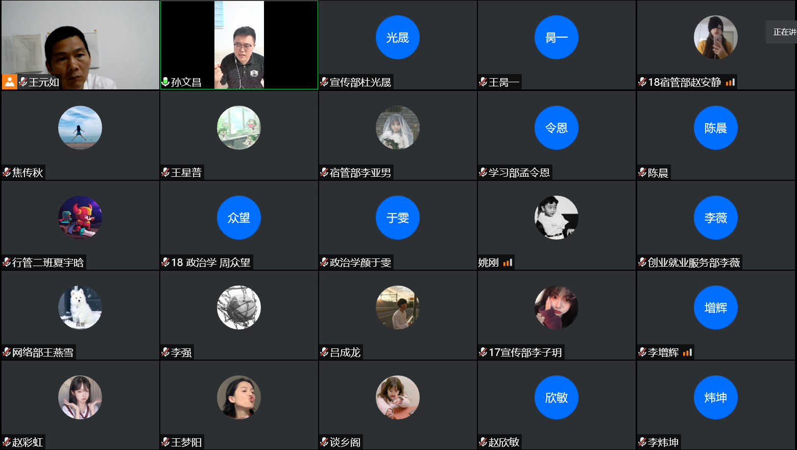 由于受到疫情的影响,同学们暂未返校,2018级竞选采取线上会议的形式进行。会议伊始,王元如简单致辞,表达对竞选选手的鼓励和对本次竞选的无限期待。在主持人明确竞选顺序后,竞选组织部的成员开始连麦答辩,打响了本次竞选的第一枪。本次会议本着公平公正公开的原则,以建立团结协作、勇于创新的学生骨干队伍为目的,对读漫屋