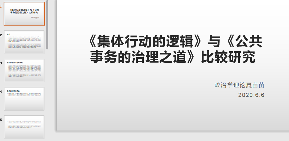 夏苗苗同学对《集体行为的逻辑》和《公共事务的治理之道》两本书进行比较研究分享。她以奥尔森的集体行为理论为着力点,主要从理性假设前提、研究思路与制度设计以及研究结论与运用领域三个方面进行比较。在此内容下,重点比较影响理性个人策略选择的内部变量、自主组织的制度设计和组织治理的具体原则,从而得出结论:奥斯特罗姆的自主治理理论突破了公共事务治理传统集体行动理论的困境,凭借其独特的优势和幽邃的洞见,在学术领域占有一席之地。但就我国而言,在特有的政治结构下,实现自主治理还需要政府给予一定的自治空间、自治资源和自治能力。