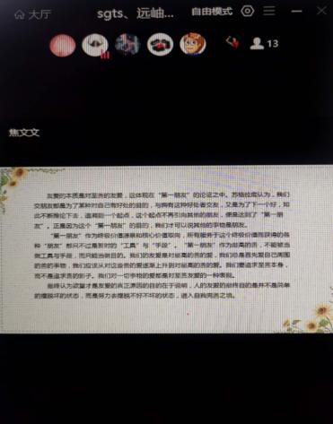 2019级焦文文同学分享了柏拉图的对话作品《吕西斯》。《吕西斯》借苏格拉底与年轻人的对话,把友爱问题与最高的善联系起来,认为真正的友爱应该引导人们走向对善的追求。此外,人们之间的友爱关系首先都是建立在两人之间爱意这种情感基础之上的,以爱者单方面对被爱者有用性的需求是无法保证双方友爱关系的建立与维持。