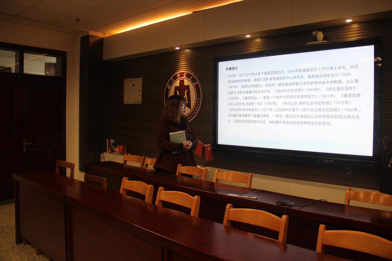 首先,夏苗苗同学对罗伯特·达尔的《现代政治分析》进行了介绍。她通过对每一章的分析,详细讲解了本书的核心内容和基本思想。全书结构清晰,论述深入浅出,提出政治学研究的各个重要问题,并用实例加以论证。但达尔片面地把西方资产阶级政治生活模式当作评判一切人类社会政治生活的标准,这种价值倾向也是西方政治学者的通病。因此,我们要客观的看待达尔的思想。