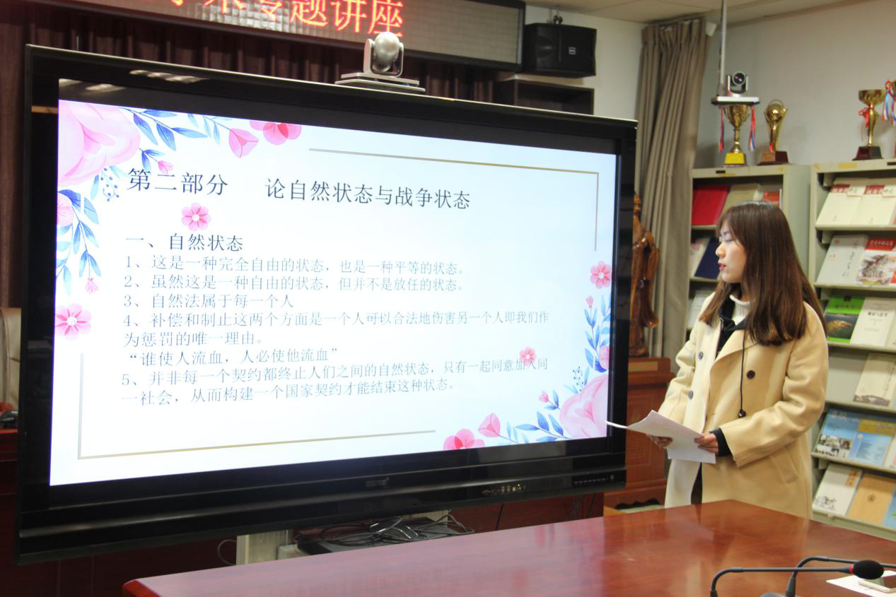 本期政研论坛读书交流会围绕洛克的《政府论》一书展开讨论交流,由三位主讲人自述读后感,并提出相关问题。首先刘绍卿同学从自然权力理论、国家建构理论、有限责任政府理论以及分权理论四个方面具体阐述了洛克的思想,并与现实社会相联系分析其借鉴作用;随后李娜同学总体概括了《政府论》一书,并就自然状态和战争状态进行解释,重点叙述了政府构建与政府解体问题;最后刘喆同学就国家理论、财产崇拜、权力学说展开了详细介绍,并提出自然状态下不同种的人为何不平等的疑问。待三位主讲人讲述完毕后,秦绪娜老师就学生在阅读文献、梳理文献中遇到的问题进行了讲解交流,为每位同学解答了困惑;随后,秦绪娜老师根据同学们的讲述提出“自然法对自然状态下的人的限制作用如何体现”问题。同学们各抒己见,积极表达自己看法,进行探讨。