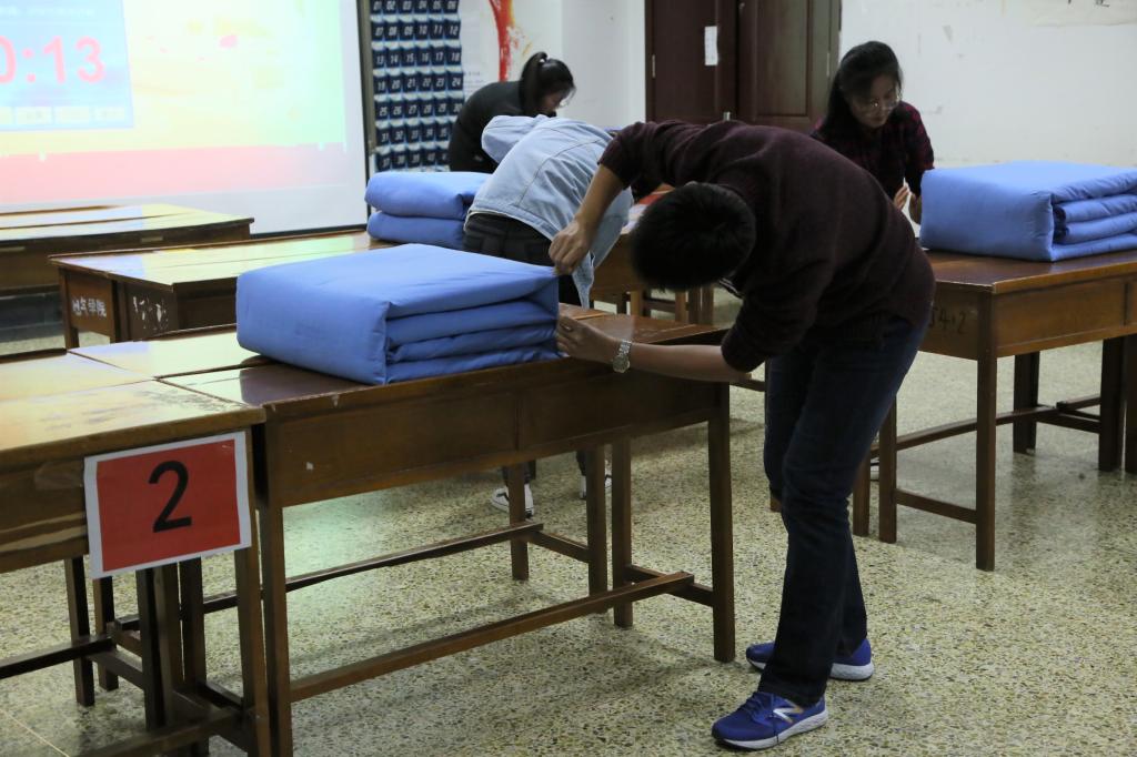 政治与公共管理学院学生会主席闫力和马克思主义学院学生会主席李增珣发表简短讲话。闫力认为此次活动的举办能够锻炼同学们整理内务的基本能力,并希望大家赛出水平、赛出风格;李增珣谈从小事做起的重要性,并对活动的顺利开展表示祝贺。比赛伊始,师哥师姐为同学们带来叠被子标准示范,两位主席也参与其中,充分发挥模范带头作用,为上场选手作出表率。正式比赛参赛选手50人共分为十组,每组随机搭配五人上场,限时5分钟。伴随着欢快轻松的背景音乐,同学们迅速开始整理被子,熟练地运用各种技巧手法,对压实理平、卡出条印、修边捏线等方面进行细致处理,在规定的时间内,原本摊平的被子变成横平竖直、整洁美观的“豆腐块”呈现在同学们眼前,被子外观棱角分明,折缝清晰,没有褶皱凹陷,精彩的叠被子过程赢得观众热烈的掌声。此外,比赛期间穿插的“齐心协力”、“你比我猜”、“反常态”等游戏环节,充分活跃现场气氛,同学们幽默风趣、生动活泼的互动一次次将比赛推向高潮。