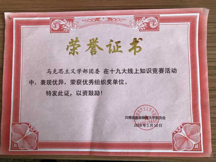 委员会主办的“十九大线上知识竞赛”活动中,马克思主义学部团委荣获“优秀组织奖单位”。