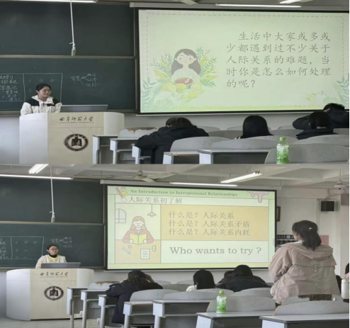 在人际交往方面,薛梦婷通过阐述人际关系的概念、特点、类型、作用等有关知识,强调了人际关系在生活中的重要性,并为同学们提供“真诚、冷静、尊重、沟通”四个词语,来帮助同学们解决人际关系的问题。陈思思则从人际关系处理中的“内耗”这一方面出发,细致描述了在人际关系处理中自身内耗的因与果,同时赠予了同学们“三颗心”即用平常心面对、用同理心协调、用自信心等待来帮助同学们打破内耗现状。