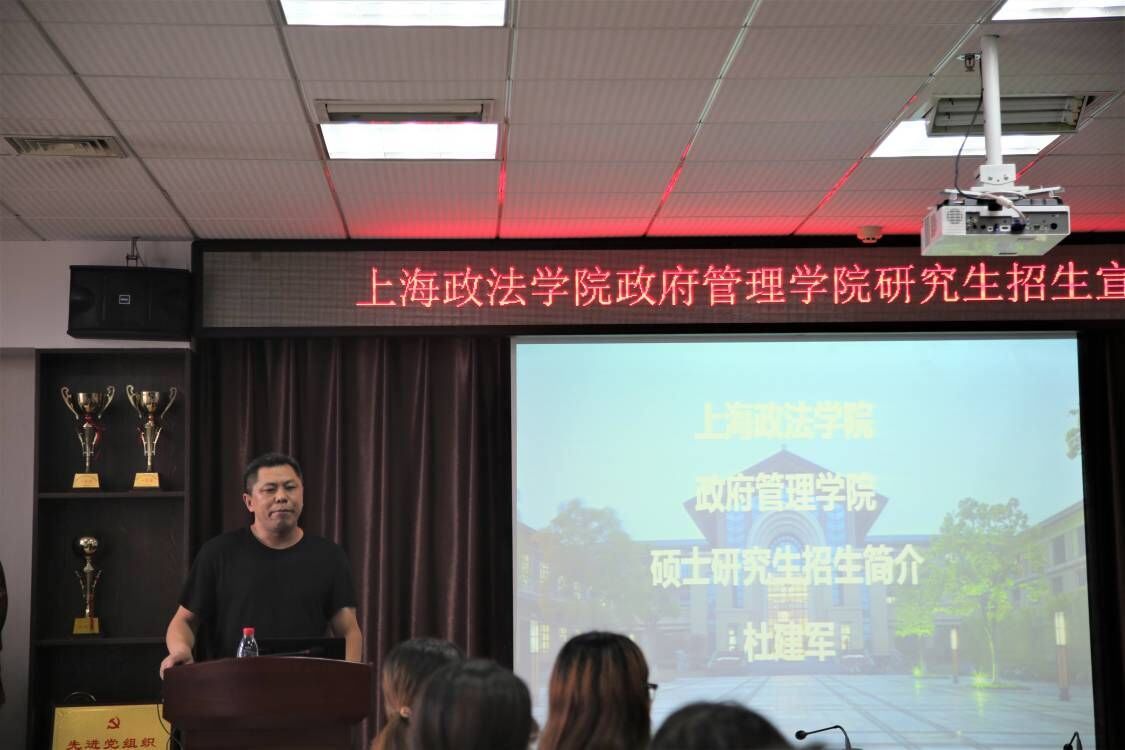 9月5日下午于JC909举行研究生招生宣讲会暨上海政法学院政府管理学院领导来访交流会,学院党委书记卢瑞霞、副院长李增元、党委副书记张忠凯、副院长林士俊、上海政法学院政府管理学院领导出席,上海政法学院杜建军主讲,2018、2019级同学和辅导员积极参与。