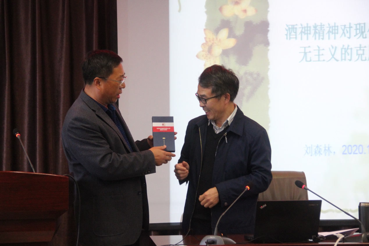 会议伊始,王维先院长向刘森林教授的到来表示了热烈欢迎,并赠与刘教授曲阜师大纪念品。刘森林教授首先对尼采的虚无主义以及“上帝之死”进行了详细阐述,虚无主义是对“物”与“无”的多层反思,而“上帝之死”是以上帝为代表的崇高的价值体系的坍塌,代表着哲学思维方式的转变。随后,为大家讲解了“酒神精神”的原理、发展经历、恢复与发展,他表示“酒神精神”是一种具有创造力的真实的崇高的力量,是对古老的“陶醉”精神的现代提升,具有“创造”和“超越恐惧的爱”这两种特性,是对纯理性主义的批判。最后,刘森林教授讲到可以用“酒神精神”来克服消极的虚无主义、隐微论的虚无主义、陀思妥耶夫斯基的功利虚无主义,提升人的创造力,追求人格的丰富性。
