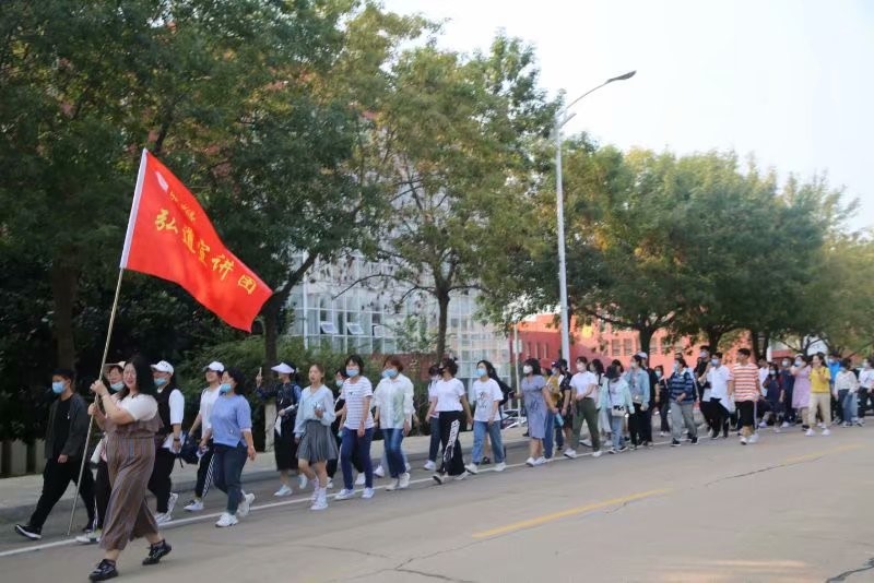 义工服务大队、视点俱乐部、边缘文学社、弘道宣讲团、仪加仪礼仪协会的带领下,全体新生排成两列进行游园。一路上经过教学楼、操场、儒风酒店以及图书馆等建筑物,领队人员为新生一一介绍学校建筑物的特点、应用功能以及校园美景,大家对校园概况和建筑文化底蕴有了初步认识,更加充分地了解了校园状况,更好地感受曲园浓厚的文化氛围,领略曲园独特之美,为日后的学习生活奠定良好的基础。