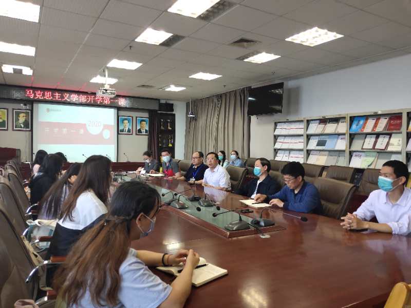 5月29日下午,马克思主义学部在会议室举行新冠肺炎疫情防控开学第一课。学部党委委员、团委书记及辅导员出席,党委副书记宋钧文主持,返校学习的15名同学全部参加并聆听授课。