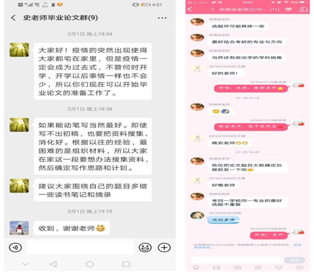 教师及时通过微信、QQ、电话等多种方式在线指导毕业生做好论文选题及写作计划,引导毕业生主动阅读文献资料,做好论文写作背景调查,材料整理等工作。
