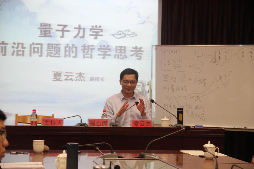 会议伊始,夏校长从量子力学的历史出发,首先,从朱清时院士的量子力学与佛学相联系的观点入手,讲解了量子力学的三个特点:第一是叠加,它是众多物理学家一起创立的;第二是精准,它是迄今为止建立的最为精确的理论,也是在社会与人类生活中应用最为广泛的理论;第三,关注度高,它在自然学界、人文社科界都引起极大关注。其次,学术界对量子力学的理解和解释目前并未达成一致,仍然存在很多问题,量子力学的结论似乎对哲学的认识论提出了新的挑战。