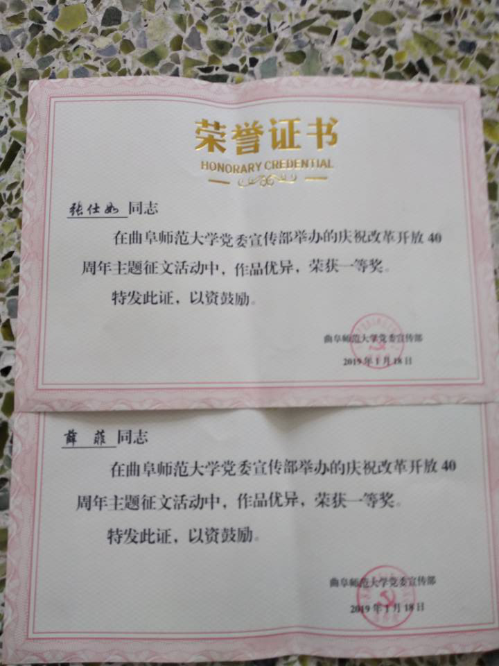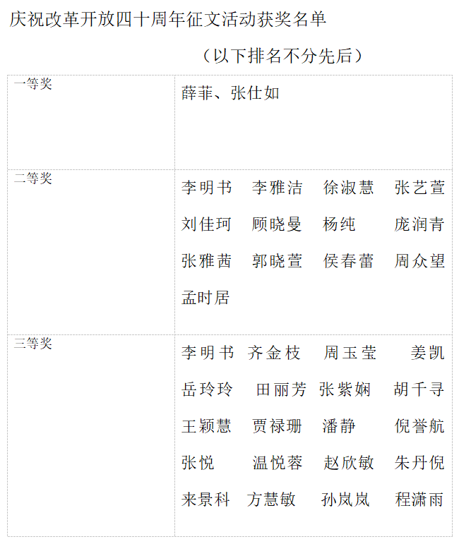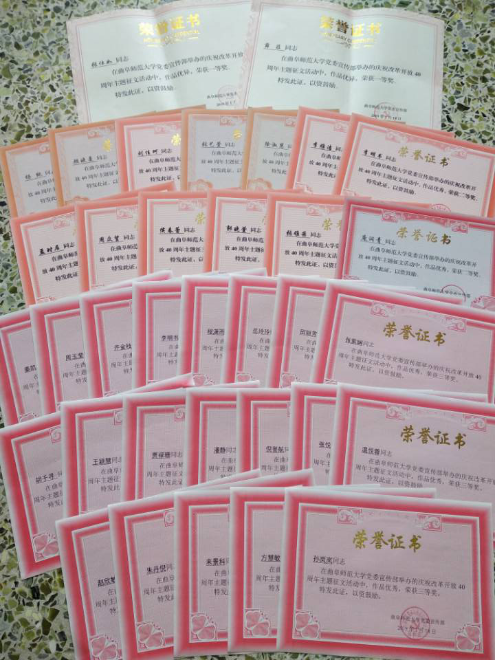 积极组织,学生踊跃参加,共有220篇征文提交学校。经过学校评审,薛菲、张仕如2人荣获一等奖,李明书、李雅洁等13名同学荣获二等奖,齐金枝、周玉莹等20名同学获得三等奖,他们在本次征文活动中真情流入、有感而发,其他参赛同学同样笔下生花。所有参赛者都将自己心中的曲园复兴与对改革开放的展望描绘尽致。