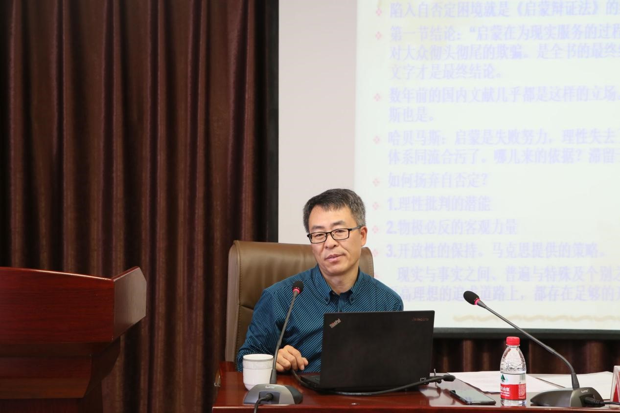 第二种辩证法是“自否定、自悖谬的辩证法”。刘森林教授将其阐释为“在不顾一切地追求绝对、纯粹、整全的同时,相对、杂多、部分与负面性也同步生长。”我们追求知识和真理,得到的却是欺骗和意识形态。人们越想要的东西反而根本得不到,得到的反而都是负面的东西。在对第二种辩证法反思之后,便出现了第三种辩证法,即“扬弃自否定的开放性辩证法”。刘森林教授向同学们讲述“如何扬弃自否定”:一是具备理性批判的潜能,再是关注物极必反的客观力量以及我们对开放性的保持。最后,刘森林教授总结表示:启蒙辩证法有走向绝对形而上学的危险,但启蒙辩证法并没有走向自否定自悖谬的困局,它最终是一种借助自我反思迈向开放性和积极性的辩证法。在现场互动环节,铁省林老师与刘教授进行了不同观点的交换讨论,同学们也就疑惑的问题与刘教授进行交流,刘教授一一回应。