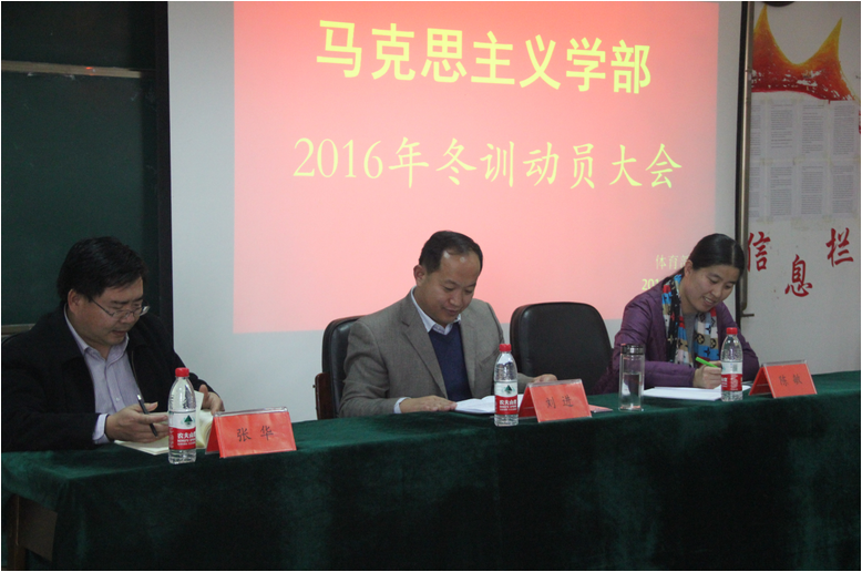 11月8日下午,由马克思主义学部学生会体育部主办的2016年冬训动员大会在JC605举行。学部党委副书记刘进、团委书记陈敏、辅导员张华老师以及主席团成员出席,训练队全体成员参加。学生会副主席庄文昊主持。