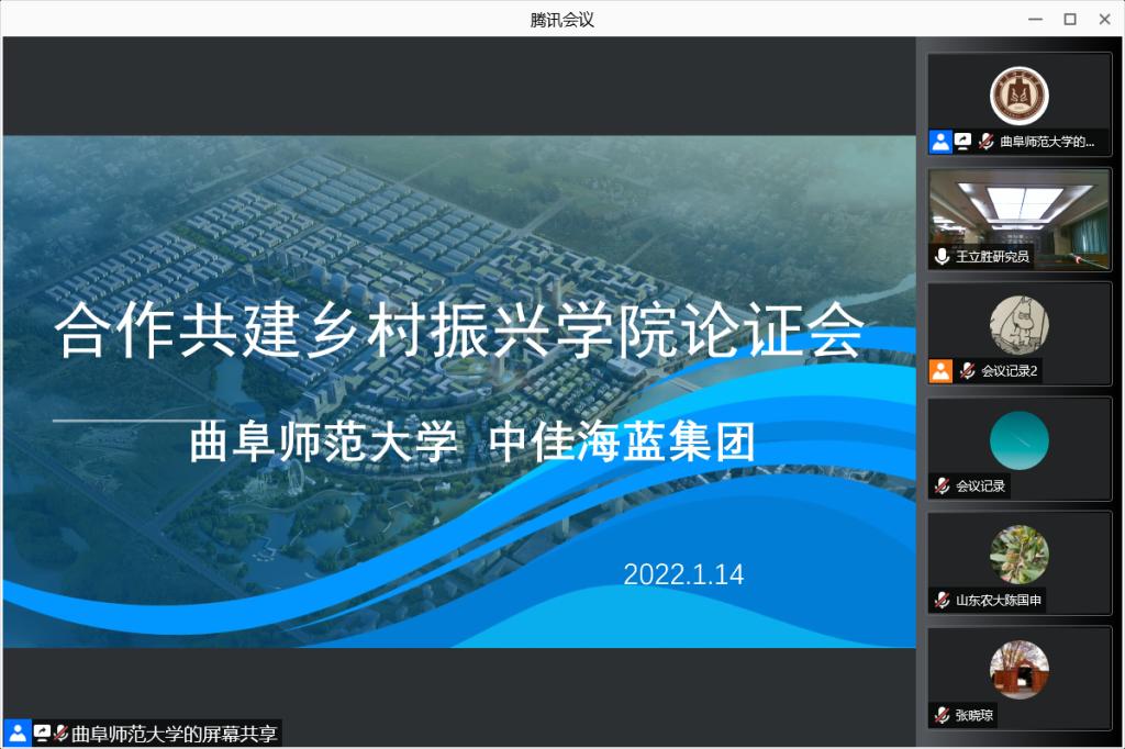 与中佳海蓝集团合作共建乡村振兴学院论证会在我校209会议室召开。本次会议采取线上和线下相结合的方式进行,曲阜师大党委常委、副校长李兆祥,中国社会科学院哲学研究所党委书记、中国文化建设研究中心主任、山东省乡村振兴学院理事会荣誉理事长王立胜,山东农业大学人文社会科学部秘书长、地方政府与乡村治理研究中心主任、公共管理学院教授陈国申,中佳海蓝企业管理(山东)集团有限公司董事长侯晓晨,曲阜师大国内合作处处长孔宪福,社会科学处处长朱莉雅以及读漫屋