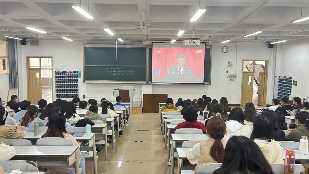 师生共同收看党的二十大开幕会,认真聆听习近平总书记代表第十九届中央委员会向党的二十大所作的报告。