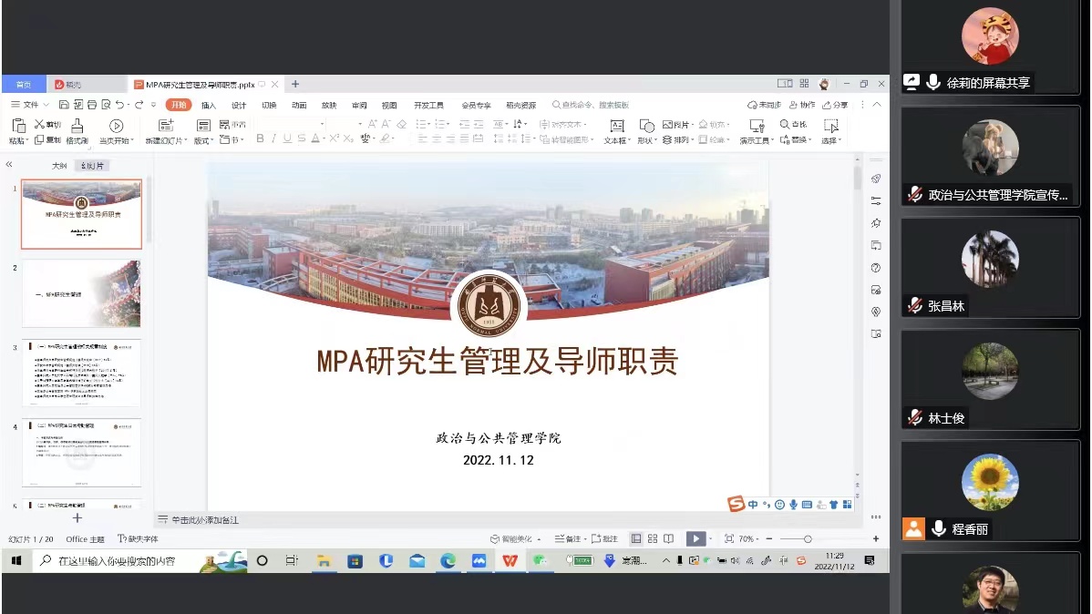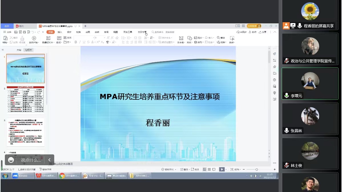 会议第三项,MPA教育中心办公室主任程香丽针对MPA研究生培养重点环节及注意事项进行讲解,从研究生论文预开题、开题、论文检测、盲审、预答辩、答辩等环节以及研究生参加公共管理案例大赛等多个方面进行详细说明。MPA研究生辅导员徐莉从MPA研究生管理及导师职责两方面向与会老师介绍我校MPA研究生日常管理制度与工作做法,明确导师在研究生的培养管理过程中的职责。