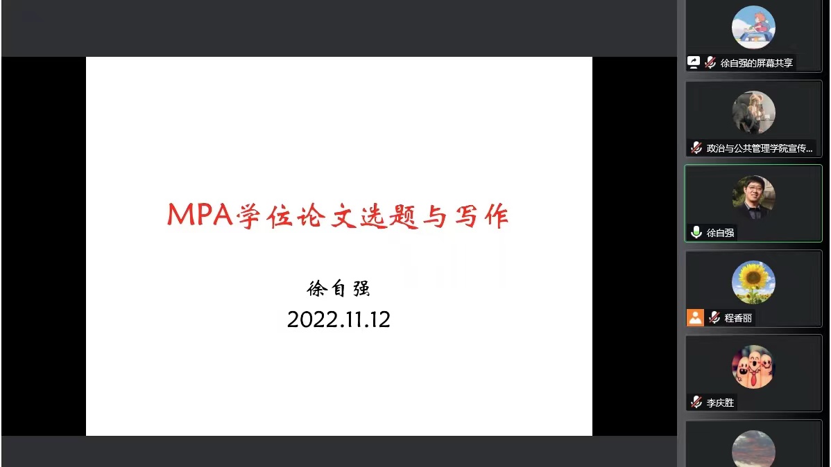 MPA研究生论文写作指导工作实际提出具有针对性的建议,报告会内容丰富详实、脉络清晰,使与会导师更加充分地了解到研究生学位论文写作的具体要求,为更好地开展MPA论文指导工作提供了工作思路。